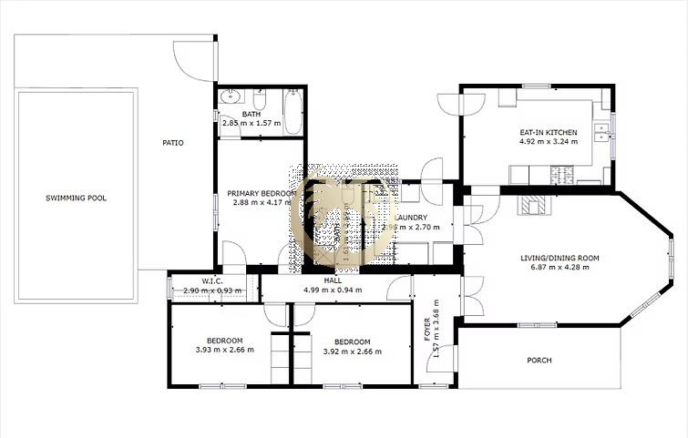 The house comprises 3 bedrooms and 2 bathrooms (1 full bathroom and 1 shower room), a large kitchen, a separate pantry/laundry room with an enclosed patio behind it, and a spacious living-dining room.