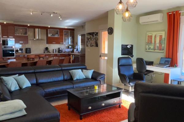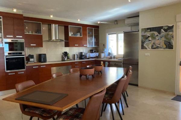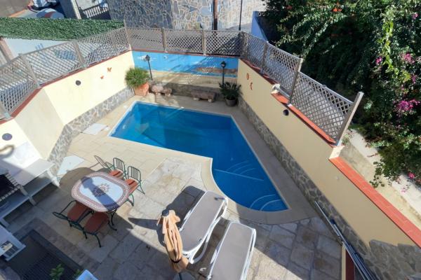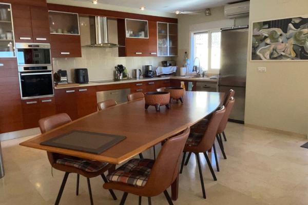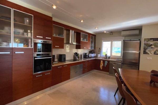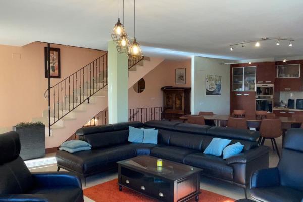 The ground floor with the main entrance has a large open-plan kitchen, bright living room, guest toilet and direct access to the private pool.