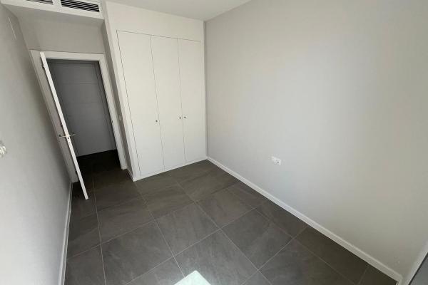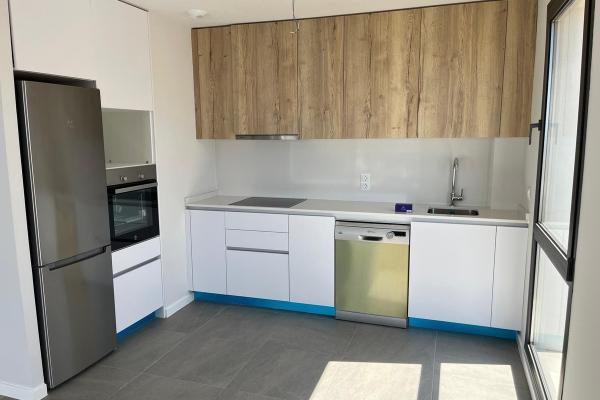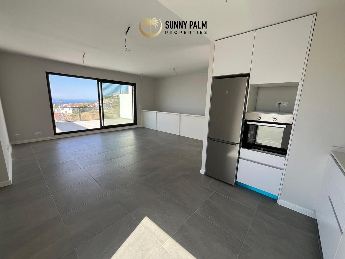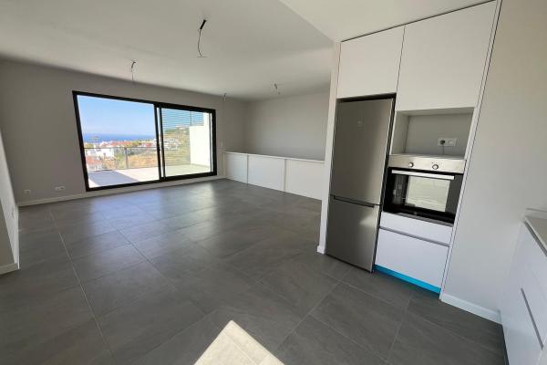 You enter the upper floor of the house, where you have an entrance hall and a guest toilet and then you go into the kitchen and living room and from the living room you have a fantastic panoramic view of the sea. In extension of the living room there is a 24m2 terrace that is southwest facing, so with lots of sun.